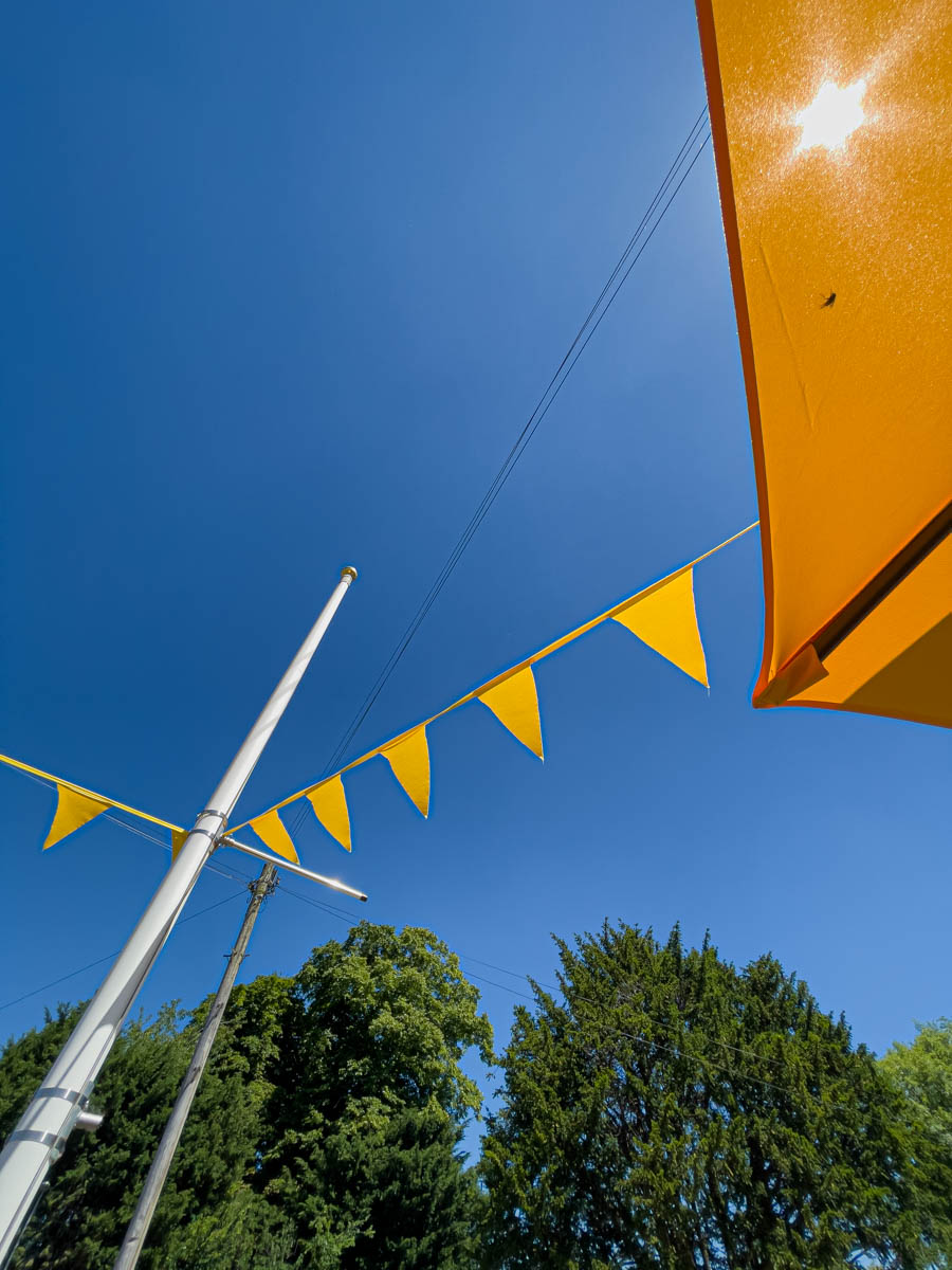 Lunch time Sue and I with Ann and Mike had out lunch outside on the new picnic benches. I was attracted by the orange brollies, blue sky and yellow bunting.
